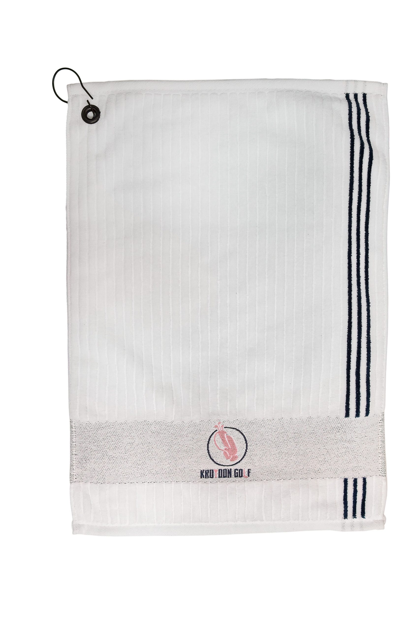 100% cotton towel has a plush TERRY finished outside and a sheared woven cotton TERRY inside; with hemmed ends. Embroidered iconic trademarked Kroydon Golf golf bag logo. Comes in size 16″ x 22″. Made in USA