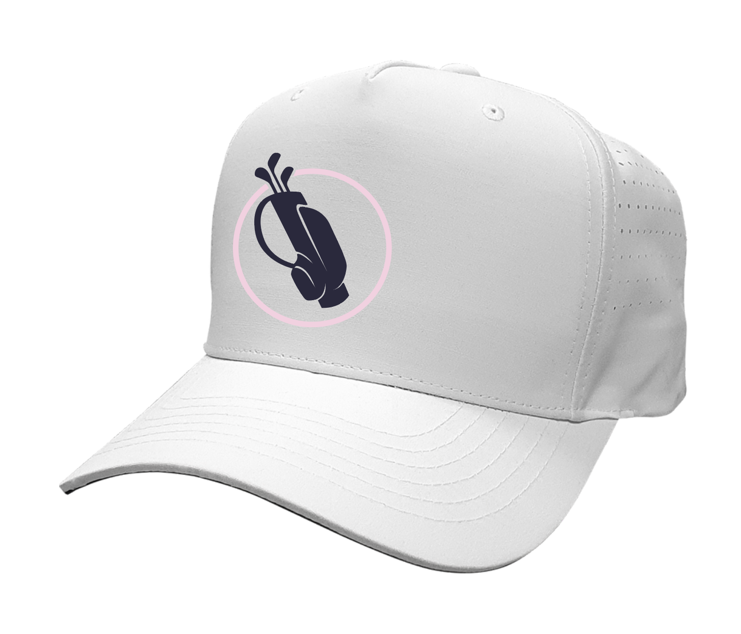 Light weight moisture wicking performance golf hat. 5 Panel Structured, Mid Crown with Curved Bill. Moisture Wicking Polyester Fabric with plastic snap closure.